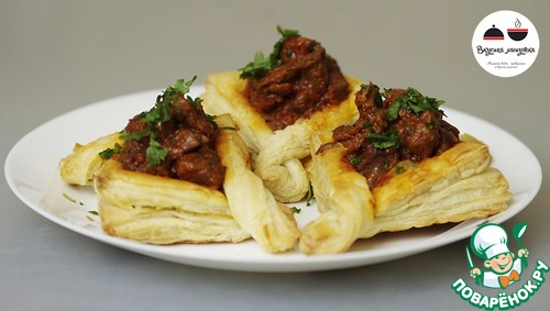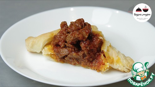 Раньше я готовила такие "пирожные" только по праздникам. Но в последнее время это блюдо у меня в повседневном меню. Начинки всегда разные. Я люблю такие пирожные с жареными грибами или с кабачковой икрой. А мальчики всегда просят: "Приготовь нам на троих мужские - с мясом..." Так мы их теперь и называем "На троих!" Сегодня в качестве начинки у меня говядина, тушеная в томатном соке. Это очень вкусно и просто, как всегда! Угощайтесь!
