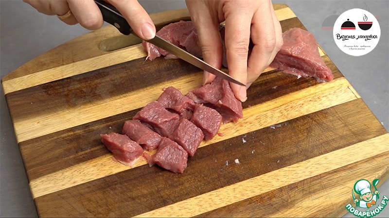 Режем мясо небольшими кусочками. Обжариваем на небольшом количестве подсолнечного масла, пока не выкипит вся жидкость, а мясо немного поджарится.