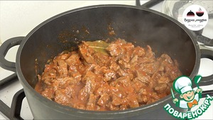 Перекладываем в кастрюлю. Добавляем нарезанный лук, лавровый лист, солим. Вливаем томатный сок. Оставляем на медленном огне до готовности. У меня это занимает минут 40.