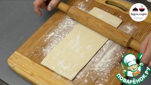 Готовим слоеные конвертики. Для этого тесто раскатываем, нарезаем на квадраты, делаем надрезы и складываем края.