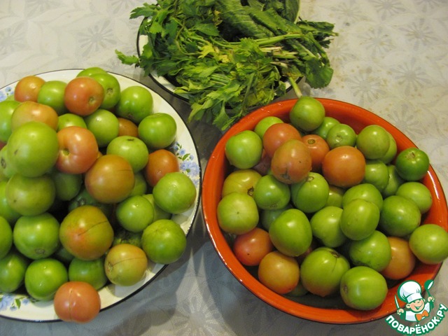 Ингредиенты даны для 8 трехлитровых банок. Помидоры выбираем твердые. Те, что розовые, еще в банках поспеют и станут красными. Моем все ингредиенты.