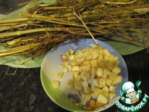 Чистим чеснок и режем дольки произвольно на кусочки.