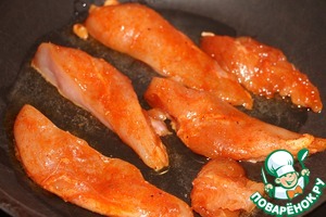 Любое мясо, в данном случае куриное филе, предварительно маринованное, обжарить или запечь.