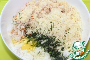 К остывшему рису добавить порезанное кубиками куриное филе, яйцо, тертый сыр, зелень (у меня укроп), если нужно приправить солью и перцем. Тщательно вымешать.