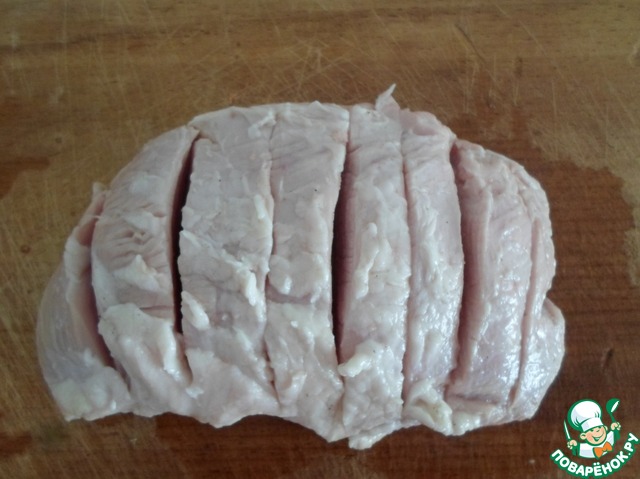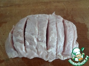 • Кусок свиного филе надрезаем, образовывая кармашки и не дорезая до конца.