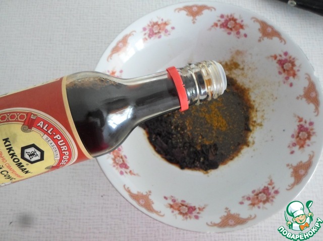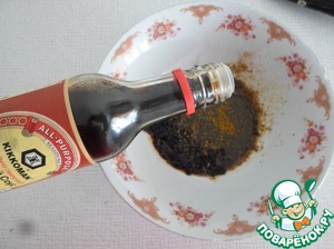 • Для маринада смешиваем сушеный базилик, соевый соус, соль, хмели-сунели.