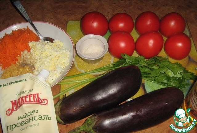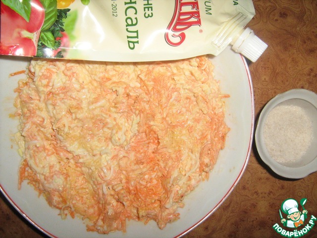 Для начинки: морковь, яйца, сыр твердых сортов, черный молотый перец, измельченный прессом либо мелко порезанный чеснок, соль. Майонез.