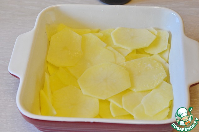 Форму для запекания смажьте маслом. Картофель нарежьте на тонкие ломтики, чуть подсолите и уложите на дно формы