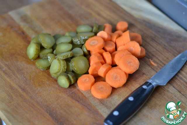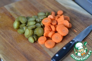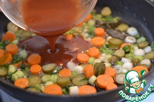 • Морковь и огурцы сцедить и добавить к жаренному луку