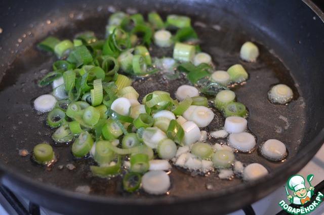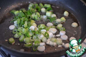 • На оставшемся масле обжарить мелко нарезанный зеленый лук и зубок чеснока
