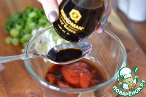 • В отдельной миске смешать кетчуп, уксус, воду, Соевый соус "Киккоман" и 2 столовые ложки крахмала. Перемешать.
