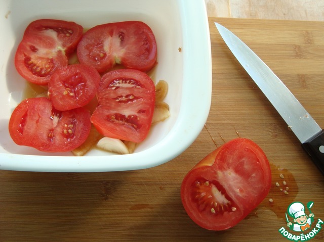 Поверх овощей выложила рыбу и на каждое филе положила по дольке помидора.