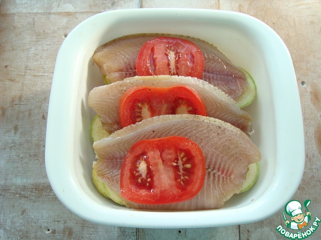 Рыба замариновалась и я её выложила на подушку из овощей: кабачок, помидор.