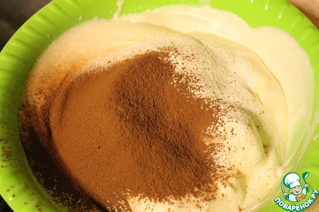 Затем добавить просеянные муку, разрыхлитель и какао. Перемешать.