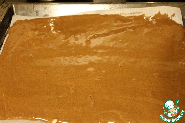 Противень застелить пергаментом и смазать 1 ч. л. растительного масла. Вылить тесто, разровнять его. Выпекать при температуре 190 градусов 15-17 минут.