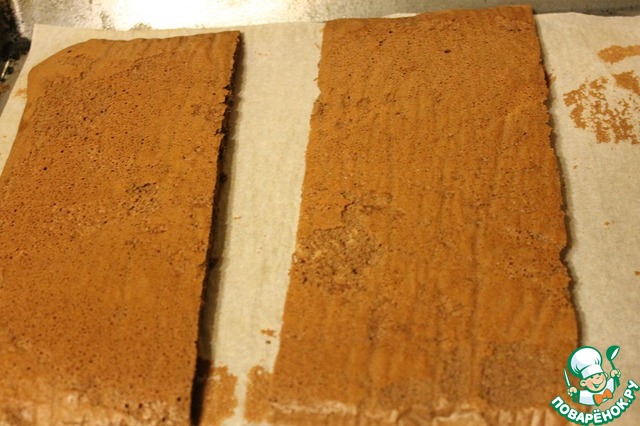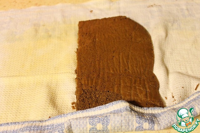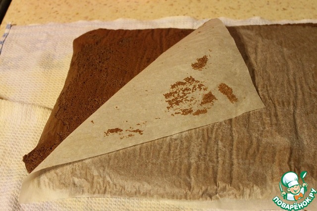 Готовый бисквит выложить на чистое полотенце пергаментом вверх. Аккуратно удалить бумагу.