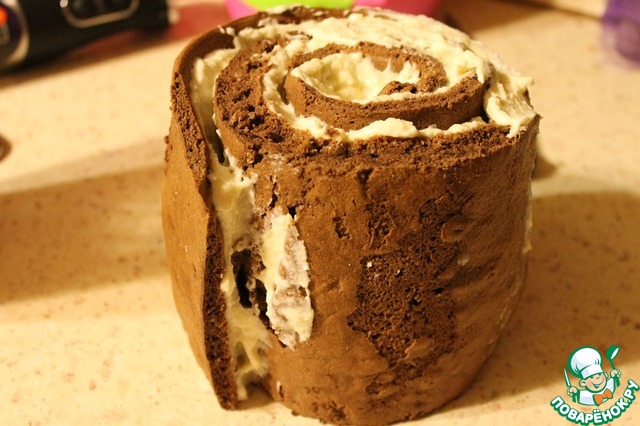 Вот такой рулет должен получиться. Если в некоторых местас потрескались бока, то их можно замазать кремом.