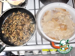 Грибы нашинкуйте крупными ломтиками, лук — кубиками и вместе с грибами обжарьте на растительном масле до золотистого цвета. Влейте 4 столовые ложки воды и тушите на слабом огне, пока жидкость не испарится.