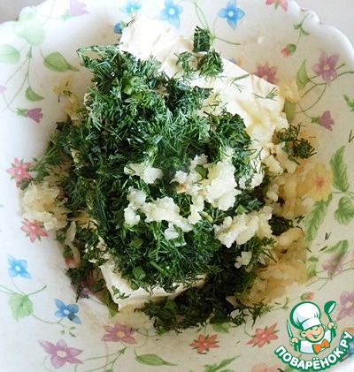 Первым делом готовим масло. Зелень вымыть, обсушить, порезать. Перемешать с размягченным маслом. Сформировать колбаску и положить в холодильник.