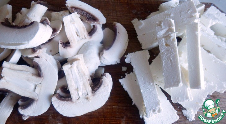Грибы нарезаем пластинами, только не тонко. Брынзу- брусочками.