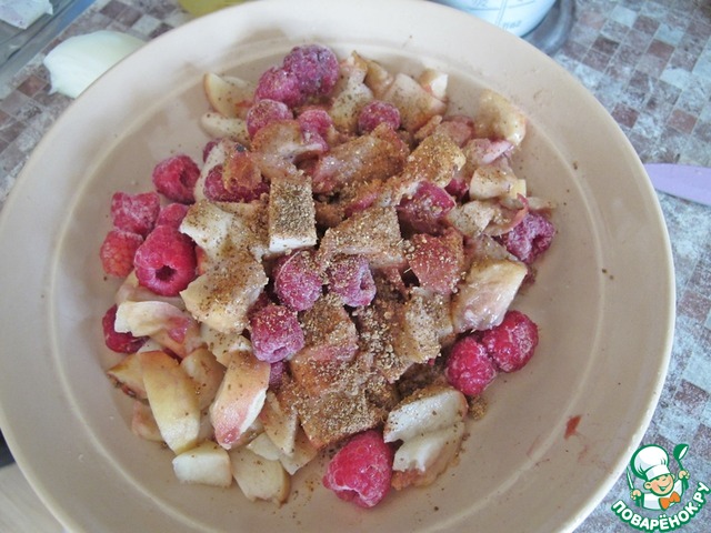Персики порезать небольшими кубиками, смешать с малиной, посыпать корицей.