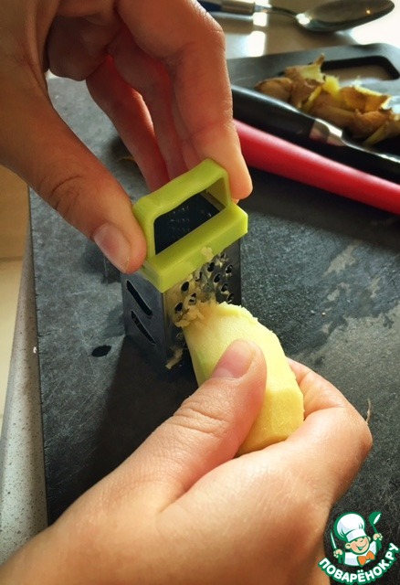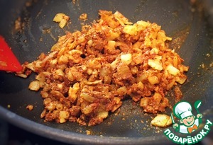 Добавьте карри, перец чили и добавьте натертый имбирь. Прогрейте все еще 3 минуты