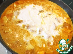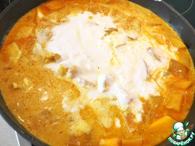 Проверьте готовность и добавьте кокосовое молоко. 400 гр Готовьте еще 10 минут