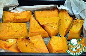 Тыкву порежьте, очистите от семечек, выложите на противень, застеленный бумагой для выпечки.