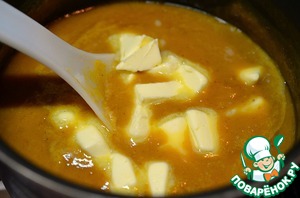 Как только смесь достигнет 116 С, снять с огня и смешать сливочное масло и лимонный сок.
