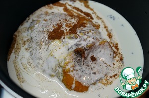 В сотейнике с толстым дном соединить сливки, тыквенное пюре и специи. Хорошо прогреть смесь, помешивать, но до кипения не доводить.
