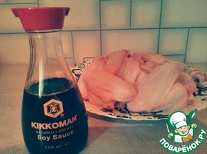 Крылышки перемешать с соевым соусом и специями. Оставить на 1 час.
