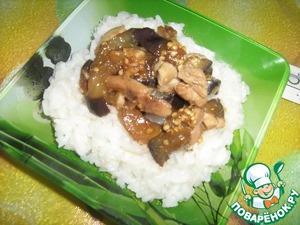 Курица хорошо сочетается с баклажанами. Резкий вкус имбиря и острота красного жгучего перца являются прекрасным дополнением. Рис завершает гармоничную вкусовую композицию.