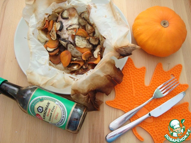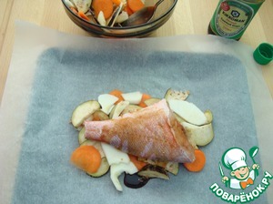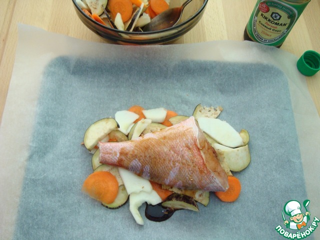 Берём пекарскую бумагу и отрезаем столько, чтобы хорошо завернуть овощи с рыбой. Пергамент выложила на противень. Выложила слой овощей, рыбу. Рыбу полила соевым соусом KIKKOMAN лёгкий. Сверху -ещё овощи.