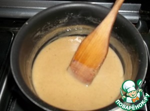 Когда сливки закипят, сразу уменьшить огонь до самого маленького, ввести взбитые с сахарной пудрой желтки. Варить, постоянно помешивая деревянной лопаткой и не давая закипеть, 5 минут. Между тем разогреть духовку.