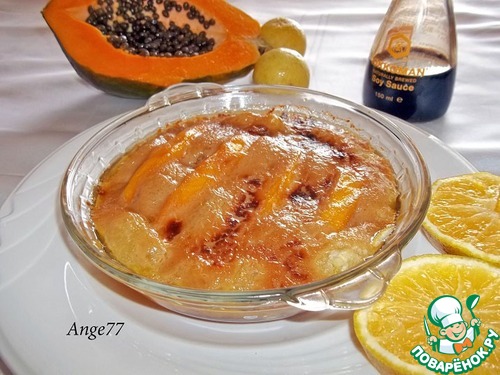 Фруктовый десерт, который подается горячим. За основу я взяла французский апельсиновый гратэн, дополнив рецепт нотками соевого соуса и ломтиками папайи (дыни). Здесь соевый соус удачно вписался в сладкую фруктово-сливочную гамму. Яркий сочный десерт скрасит осенние пасмурные деньки.