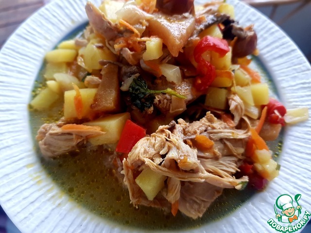 4. В готовый картофель выкладываем содержимое сковороды, солим, добавляем пару лавровых листиков, черный перец, травы какие предпочитаете.