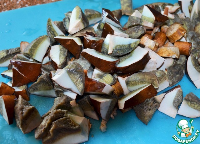 Пока замешивается тесто, приготовить начинку. Грибы перебрать ( используйте только хорошо знакомые Вам грибы, свеже собранные ), вымыть, нарезать.