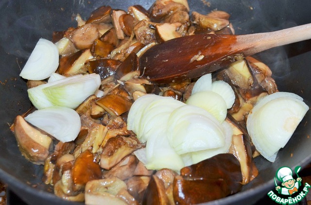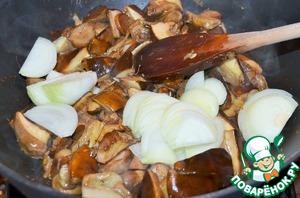 В сухую разогретую сковороду выложить грибы, потушить их в собственном соку, 10 минут. Добавить резанный лук, растительное масло и жарить еще 5 минут, помешивая, на среднем огне.