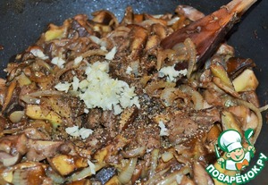 Добавить рубленный чеснок, черный молотый перец, перемешать и убрать с огня. Начинка готова.