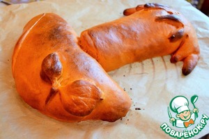 Тесто разделить на две, почти одинаковые, части. Оставить немного для украшения. Одну часть раскатать или размять руками в круг. Выложить начинку, защепить, придать форму полукруга. Это "шляпка" гриба. Вторую часть - прямоугольником, начинить грибами и сформовать "ножку".