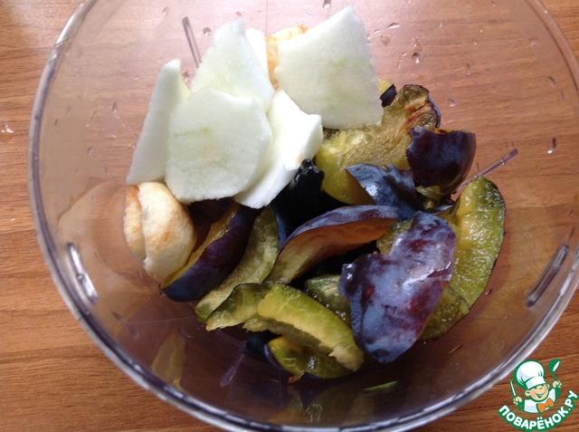 Яблоко очистить от кожи и семян, из сливы вытащить косточки. Произвольно порезать сливу, яблоко и чеснок, загрузить в чашу блендера и пюрировать.