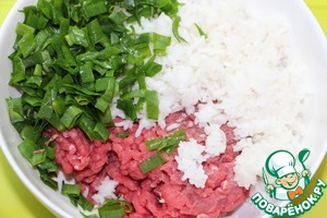 К мясному фаршу добавить остывший рис и рубленый зеленый лук. Перемешать.