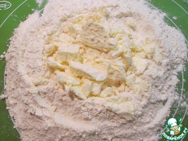 Муку просеять на рабочую поверхность, смешать с сахаром и разрыхлителем. Добавить холодное сливочное масло, порезанное на кусочки, и перетереть руками в крошку. Полученную массу разделить на две равные части. Ингредиенты для начинки выложить в чашу блендера и пробить до однородной массы.