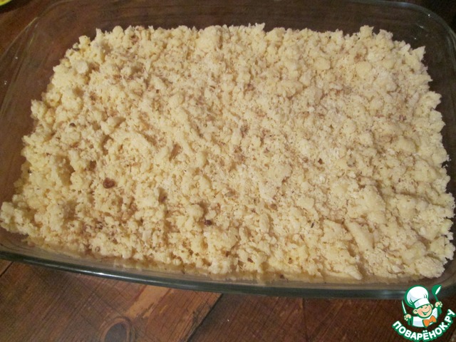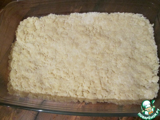 Сверху посыпаем оставшимся тестом, уже не уплотняя. Выпекаем при 200 градусах примерно минут 30. Остывшее печенье режем на кусочки.