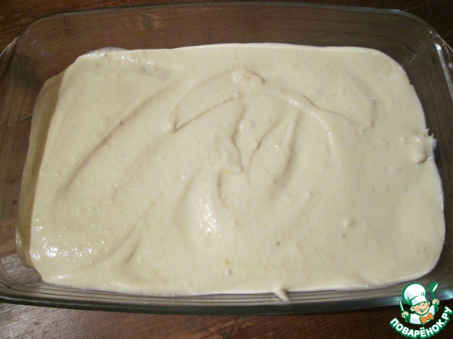 В форму для запекания выкладываем одну часть теста и слегка ее уплотняем.