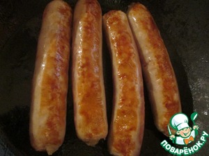 Сосиски обжариваем с двух сторон, сначала толстенькие...