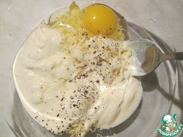 Сметану перемешать с тертым сыром, яйцом, посолить и поперчить.