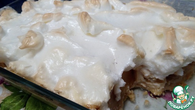 Вы ищете вкусный и эффектный, но в тоже время простой и незамысловатый рецепт? Тогда это то, что вам нужно. Всего из 5 ингредиентов вы приготовите потрясающий десерт, который великолепно подойдет как для чаепития в кругу семьи, так и для праздничного стола. Сочетание кислых яблок с вареной сгущенкой и нежной меренгой сведет с ума любого. А после остывания на нем появляются карамельные капельки-"слезы" - очень красиво...