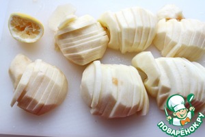Яблоки очистить от кожуры и сердцевины, нарезать небольшими дольками. Чтобы яблоки были еще кислее и не темнели, я дополнительно полила их лимонным соком, но этот шаг можно пропустить.