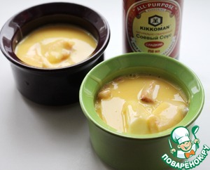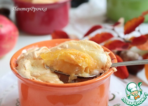 Яблоки выложить в рамекины, залить их на 3/4 "тестом". Поставить в предварительно разогретую до 180 градусов духовку на 30 минут.